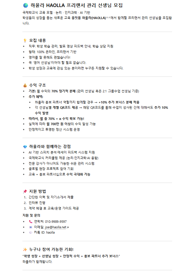하올라 HAOLLA 프리랜서 관리 선생님 모집 페이지 정보 작성자 하OOOOOOOOO표 작성일25-08-28 16:20 조회425회 연락처 010-9989-9597 급여 협의 : 실적에 따라 월 700 만 이상도 가능 관련링크 본문 첨부 이미지 확인! 주소 : 제주특별자치도 제주시 오라이동 1202-1 1층 이전글 다음글 목록