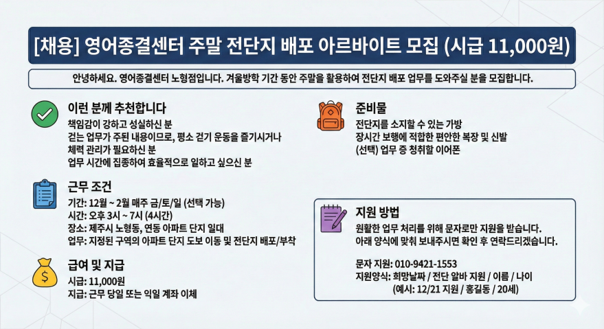 [주말 꿀알바] 영어학원 전단지 배포 알바 모집(친구랑 같이 지원!) 페이지 정보 작성자 lOOOOOe 작성일25-12-23 14:08 조회167회 연락처 010-9421-1553 급여 시급 : 11000 관련링크 본문 주소 : 제주특별자치도 제주시 월랑로 59 세흔빌딩 6층 이전글 다음글 목록