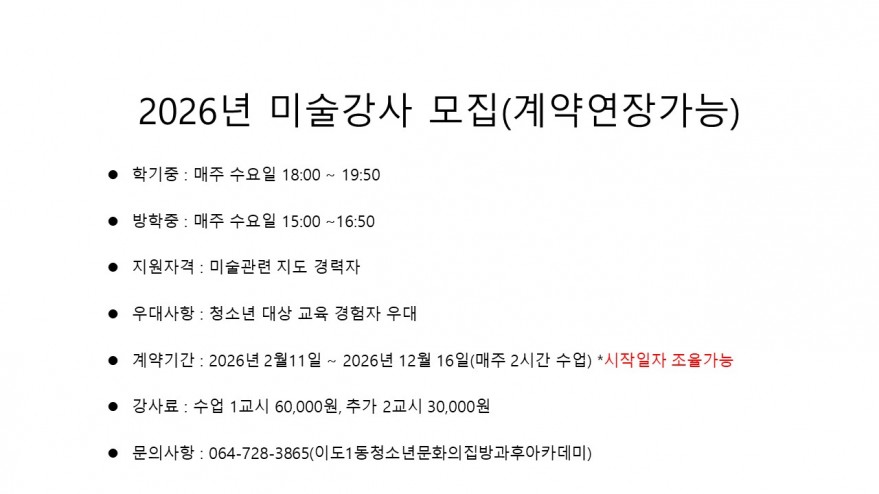 초중 청소년 대상 미술 강사 구인 페이지 정보 작성자 복O초 작성일26-01-16 15:43 조회25회 연락처 010-000-0000 급여 시급 : 45,000 관련링크 본문 주소 : 제주특별자치도 제주시 서광로29길 17 이전글 다음글 목록