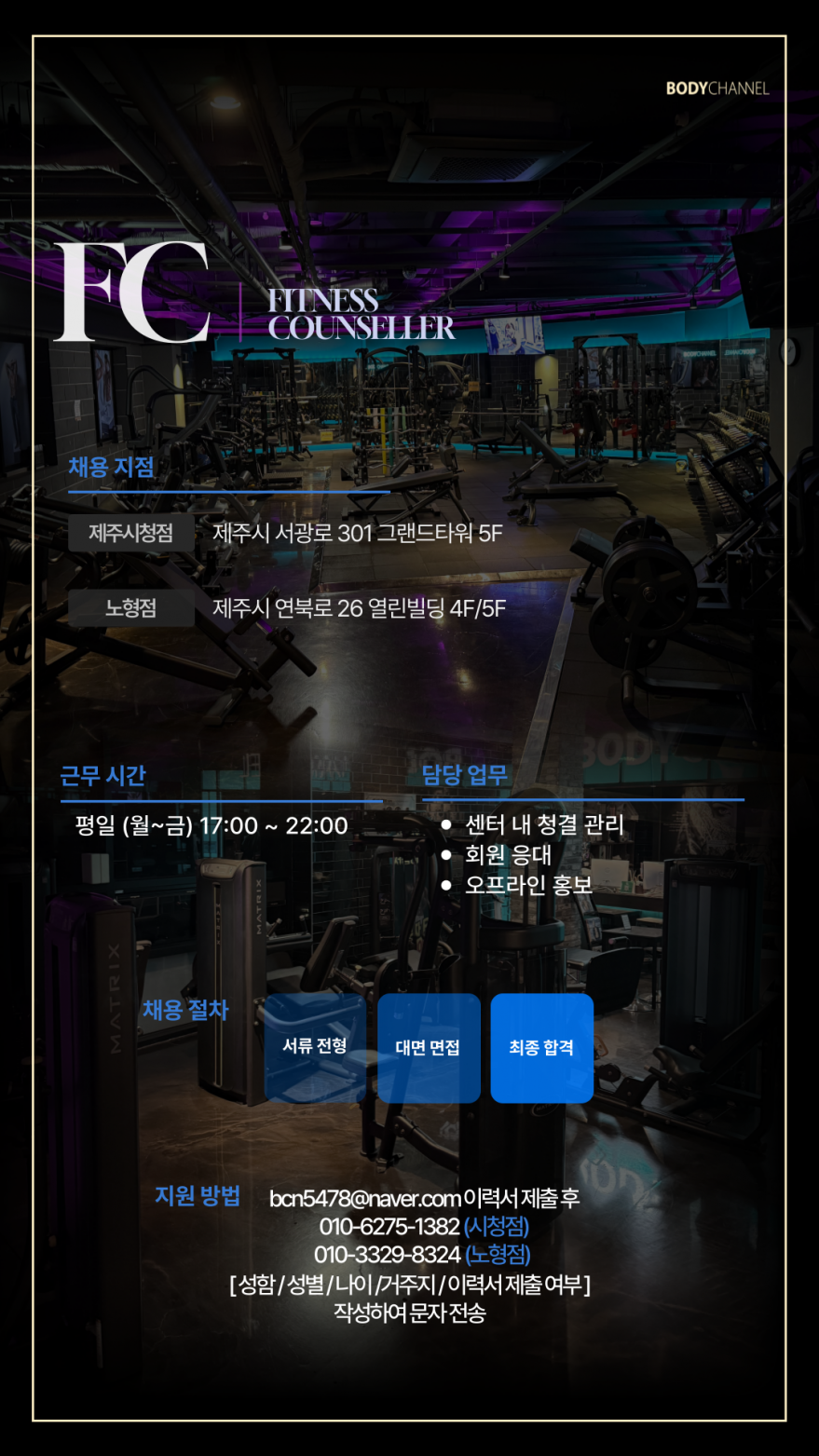바디채널 제주시청점, 노형점에서 FC / CS 를 맡아주실 직원분들을 구인합니다.