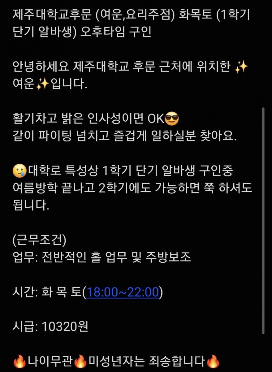 제대 후문 여운에서 구인합니다 페이지 정보 작성자 여운 작성일26-02-24 18:36 조회107회 연락처 010-5606-1020 급여 시급 : 10320 관련링크 본문 같이 일해요❤️ 주소 : 제주특별자치도 제주시 산천단동1길 7 여운 이전글 다음글 목록