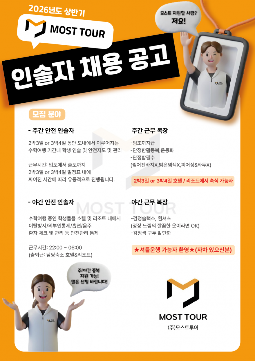 수학여행 안전요원 주.야 단기도 가능! 페이지 정보 작성자 아OOO해 작성일26-03-03 13:02 조회131회 연락처 010-8238-5811 급여 일당 : 120000 관련링크 본문 제주 수학여행 주.야 안전요원 구해요! 단기 가능 . 친구끼리 지원 가능 궁금하신 점은 아래 연락처로 연락 부탁 드립니다 010-5037-0097 주소 : 제주특별자치도 제주시 모시길 14 더 모스트 이전글 다음글 목록