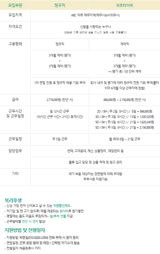 ABC-MART ST 제주롯데마트점 정규직 및 파트타이머를 모집합니다 페이지 정보 작성자 wOOOOs 작성일26-03-04 09:49 조회11회 연락처 010-8283-2394 급여 월급 : 2,776,080원 관련링크 본문 . 주소 : 제주특별자치도 제주시 연북로 1 롯데마트 제주롯데마트 3층 ABC마트 이전글 다음글 목록