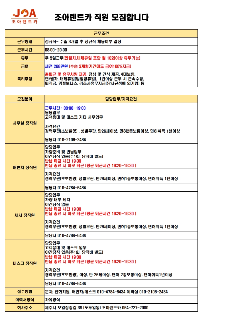 조아렌트카에서 직원을 모집합니다 ~ 출퇴근,휴무차량 제공 !!!! 페이지 정보 작성자 jOOOOa 작성일26-03-06 09:00 조회30회 연락처 010-4784-6434 급여 월급 : 288만원 관련링크 본문 . 주소 : 제주특별자치도 제주시 오일장중길 39 조아렌트카 이전글 다음글 목록