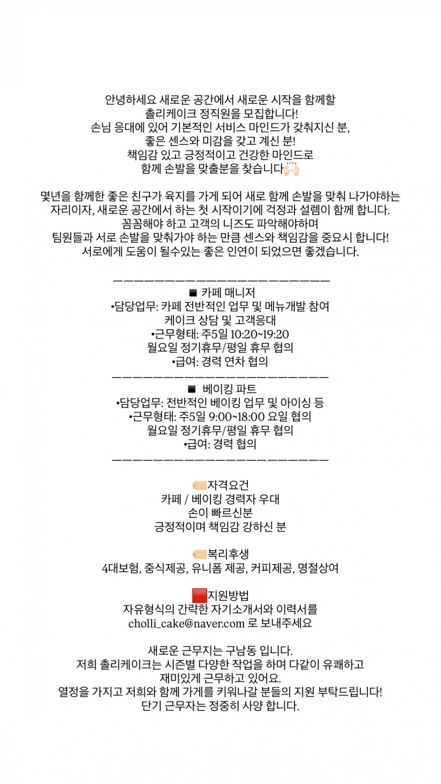 카페 정직원 / 베이킹 직원 모집 합니다 ! 페이지 정보 작성자 cOOOOe 작성일26-03-06 20:46 조회115회 연락처 010-1111-1111 급여 월급 : 협의 관련링크 본문 주소 : 제주특별자치도 제주시 구남로6길 28 이전글 다음글 목록