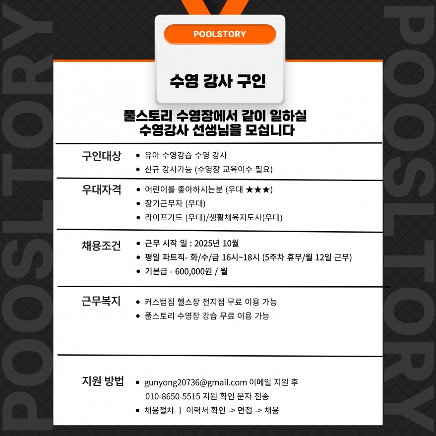 [제주]풀스토리 수영장 평일 파트 체용(여자 강사 선생님) 페이지 정보 작성자 pOOOOOOOy 작성일25-09-09 14:10 조회338회 연락처 010-8650-5515 급여 월급 : 600000 관련링크 본문 주소 : 제주특별자치도 제주시 연사6길 57 지하1층 풀스토리수영장 이전글 다음글 목록