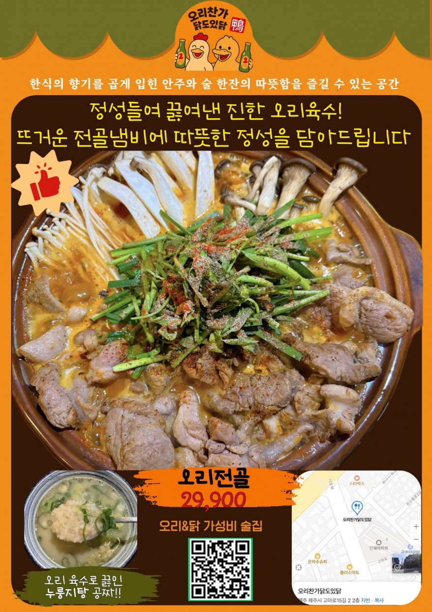 2만원대 가성비 좋은 오리전골에 몸보신하기 좋으며 기본으로 주신 오리누지탕이 킥! 바로 술을 부릅니다. 사장님이 친절하시고, 서비스까지 챙겨주셔서 감동 먹었어요!!