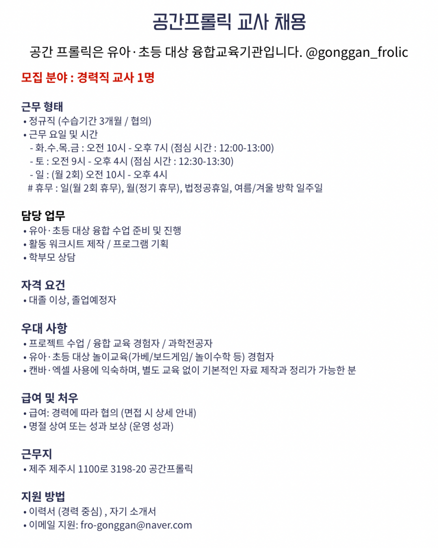 밝고 성실한 정규직 선생님, 보조 선생님 구합니다.