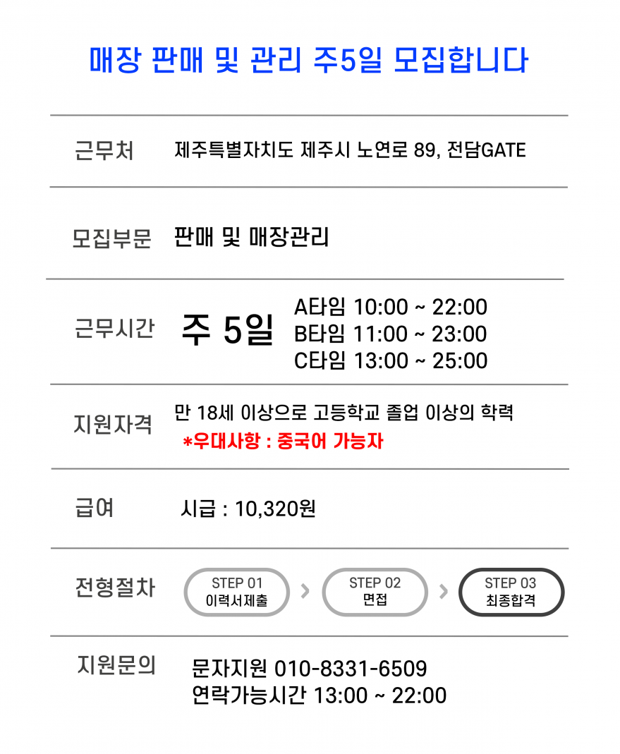 ★★★세상에서 제일 쉬운 판매직 직원을 모집합니다★★★ 페이지 정보 작성자 곽O식 작성일25-12-12 19:46 조회10회 연락처 010-8331-6509 급여 시급 : 10,320 관련링크 본문 ■ 주업무 : 고객이 물건 선택하면 결제 후 봉투에 담아드리기.외워야 할 내용 거의 없음.■ 근무지 : 연동 주소 : 제주특별자치도 제주시 노연로 89 1층 전담GATE 이전글 다음글 목록