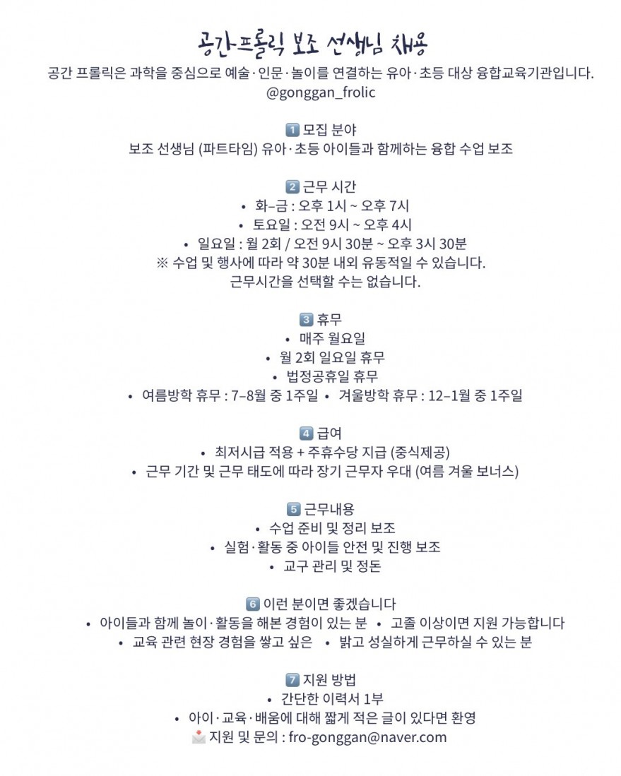 밝고 성실한 보조 선생님 구합니다. 페이지 정보 작성자 GOOOOOn 작성일26-02-02 16:51 조회42회 연락처 010-5065-0196 급여 월급 : 최저+주휴수당 관련링크 본문 주소 : 제주특별자치도 제주시 1100로 3198-20 101-2호 공간프롤릭 이전글 다음글 목록