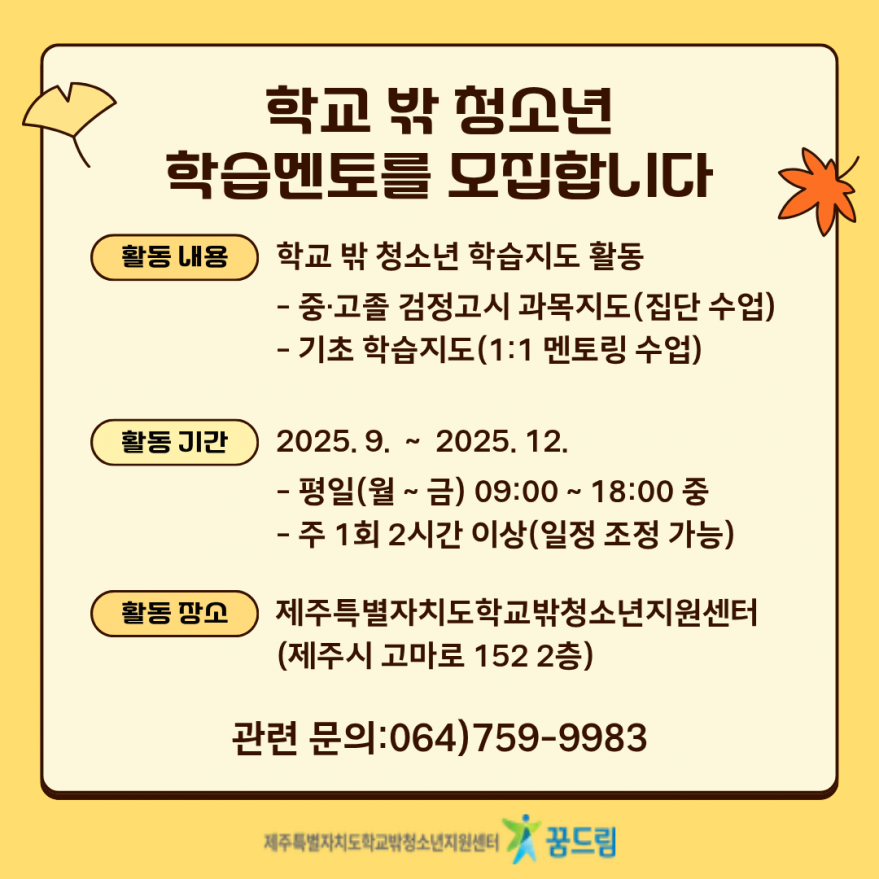 : 25. 09. ~ 25. 12. / 평일 중 주 1회 2시간 이상: 제주특별자치도학교밖청소년지원센터