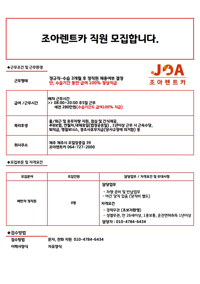 (ง •̀_•́)ง ㈜조아렌트카 배차 정직원 모집합니다. 출퇴근/휴무 차량 지원 페이지 정보 작성자 jOOOOa 작성일25-08-05 12:29 조회816회 연락처 010-4784-6434 급여 월급 : 280만원 관련링크 본문 주소 : 제주특별자치도 제주시 오일장중길 39 조아렌트카 이전글 다음글 목록
