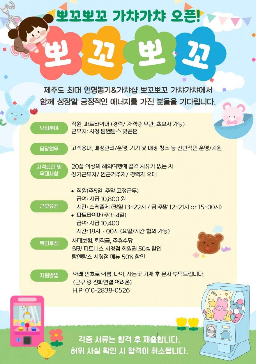 제주최대 인형뽑기,가챠샵에서 오픈 멤버를 구합니다. 페이지 정보 작성자 nOOOOy 작성일26-02-05 23:55 조회182회 연락처 010-2838-0526 급여 시급 : 10800 관련링크 본문 오래 함께 할 밝은 직원을 구합니다.~! 주소 : 제주특별자치도 제주시 광양11길 2 아남빌딩 1&2층 이전글 다음글 목록