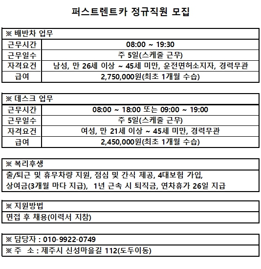 퍼스트렌트카_배반차_및_데스크_직원모집 페이지 정보 작성자 퍼OOz 작성일25-09-11 14:13 조회326회 연락처 010-9922-0749 급여 월급 : 275만원 관련링크 본문 연락바랍니다. 주소 : 제주특별자치도 제주시 신성마을길 112 1층 이전글 다음글 목록