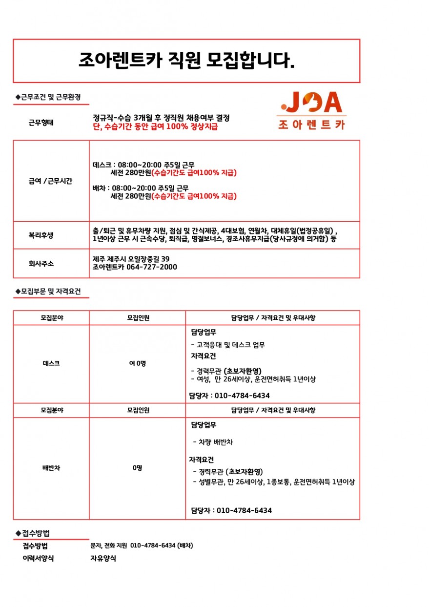 조아렌트카 데스크/배차 정직원 모집합니다. 출퇴근/휴무 차량 지원 페이지 정보 작성자 jOOOOOt 작성일25-06-21 12:03 조회859회 연락처 010-4784-6434 급여 월급 : 280만원 관련링크 본문 주소 : 제주특별자치도 제주시 오일장중길 39 조아렌트카 이전글 다음글 목록
