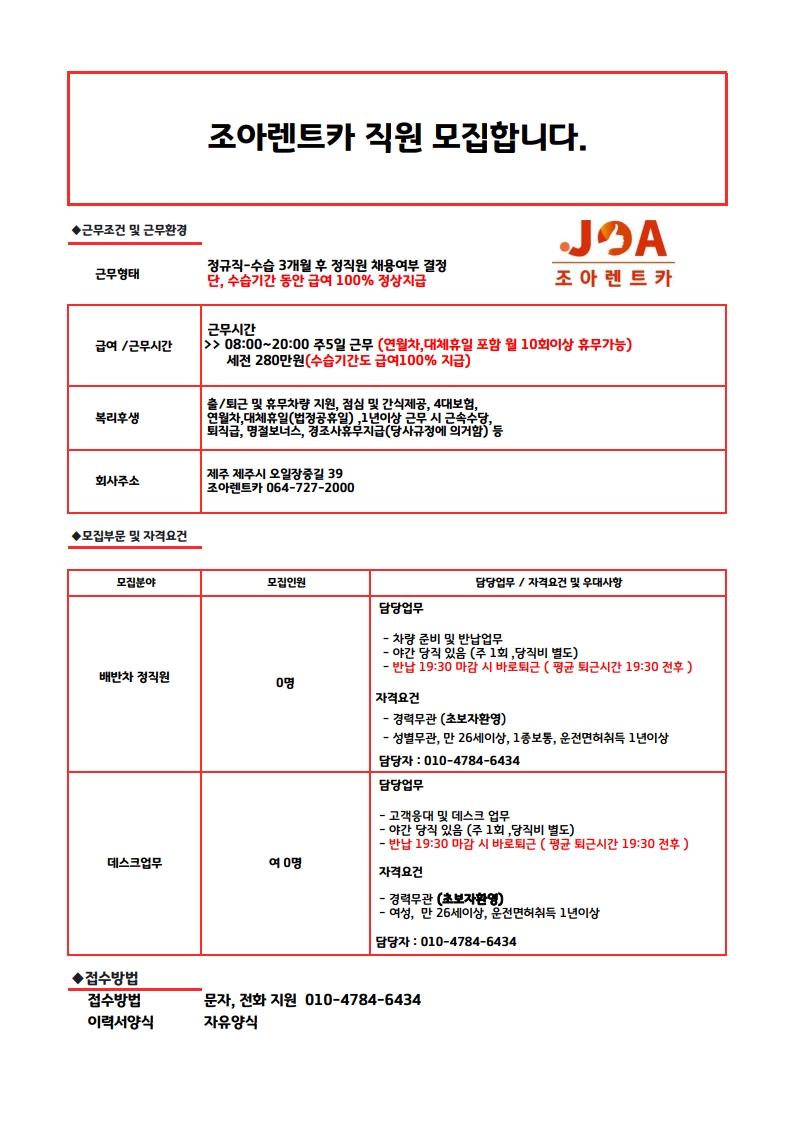 (❀╹◡╹) ㈜조아렌트카 데스크/배차 정직원 모집합니다. 출퇴근/휴무 차량 지원 페이지 정보 작성자 jOOOOa 작성일25-08-23 09:07 조회3,731회 연락처 010-4784-6434 급여 월급 : 280만원 관련링크 본문 주소 : 제주특별자치도 제주시 오일장중길 39 조아렌트카 이전글 다음글 목록