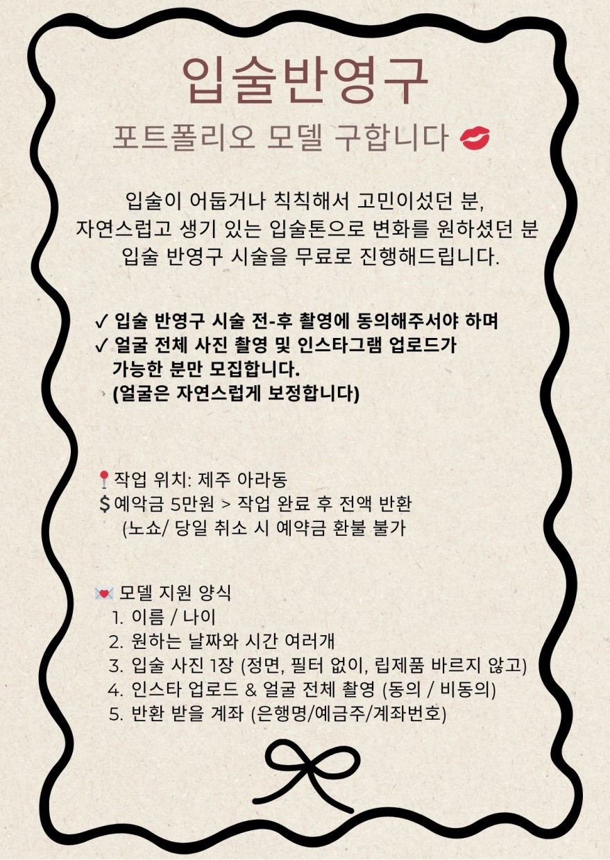 ❤️아라동❤️입술반영구 모델 모집❤️ 페이지 정보 작성자 겨리 작성일25-05-30 12:14 조회1,011회 연락처 010-2230-6689 급여 협의 : 0 관련링크 본문 작업사진은 인스타 @gonggan__beauty 지원양식 작성해서 문자로 부탁드려요~ 주소 : 제주시 인다5길 11-8 이전글 다음글 목록