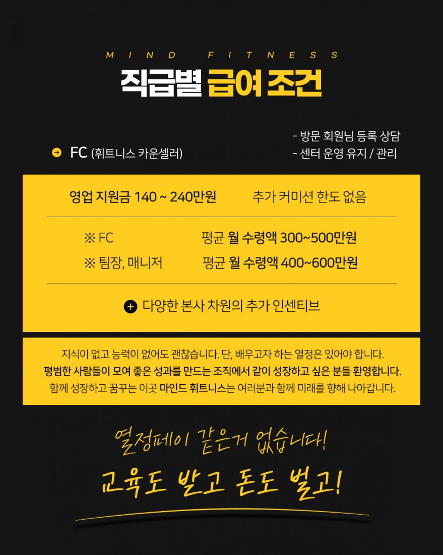 경력이 조금 부족하거나, 혹은 꾸준한 성장을 원하시는 경력직 선생님이라면 마인드휘트니스 체계적인 교육과 함께 리더들이 솔선수범과 동료들의 존중,배려를 받으며 빠르게 성장시켜드리도록 하겠습니다.