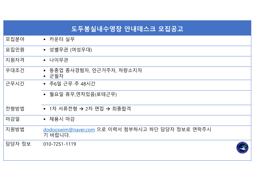 도두봉실내수영장에서 데스크 직원 모집합니다. 페이지 정보 작성자 도OOOOOO장 작성일26-03-01 20:43 조회49회 연락처 010-7251-1119 급여 월급 : 2500000 관련링크 본문 연락주세요 주소 : 제주특별자치도 제주시 서해안로 202 도두봉실내수영장 이전글 다음글 목록