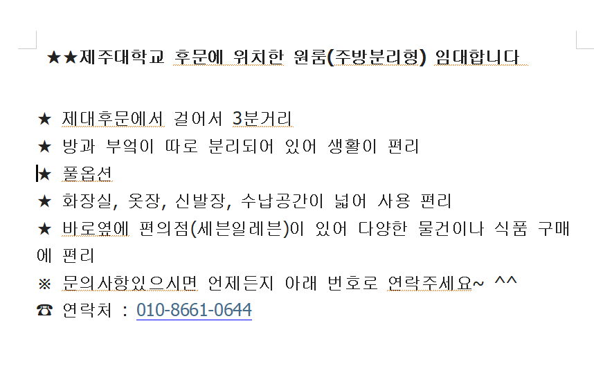 원룸/투룸/쓰리룸 | 제주대학교_후문_주방분리형_원룸_임대 페이지 정보 작성자 lOOOOn 작성일26-02-22 22:40 조회261회 연락처 010-8661-0644 관련링크 본문 연락주세요^^ 주소 : 제주시 산천단동 3길 8-1 다음글 목록