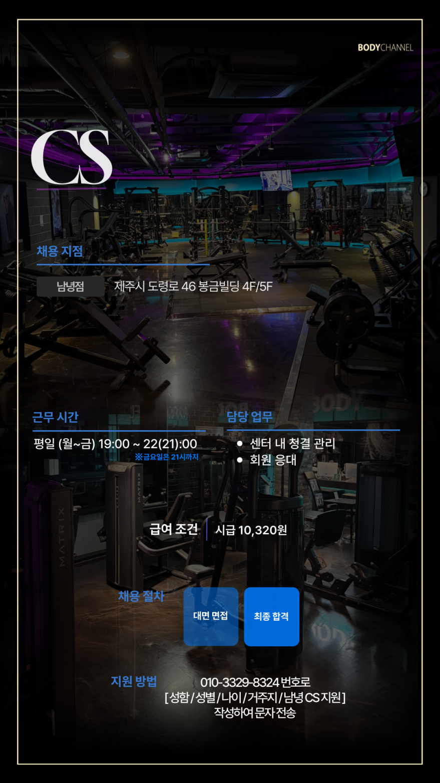 바디채널 남녕점에서 평일 저녁 CS 를 맡아주실 직원을 구인합니다.