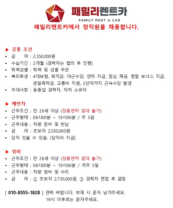 패밀리렌트카 배반차, 정비 직원 구인 페이지 정보 작성자 패OOOO카 작성일26-04-11 08:45 조회63회 연락처 010-8555-1828 급여 월급 : 255만+@ 관련링크 본문 연락주세요 주소 : 제주특별자치도 제주시 제성1길 67 패밀리렌트카 이전글 다음글 목록