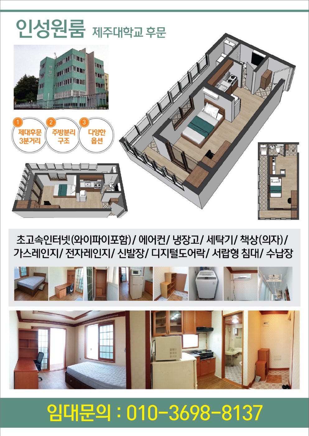 원룸/투룸/쓰리룸 | 제주대 후문 3분거리 인성 원룸 임대!