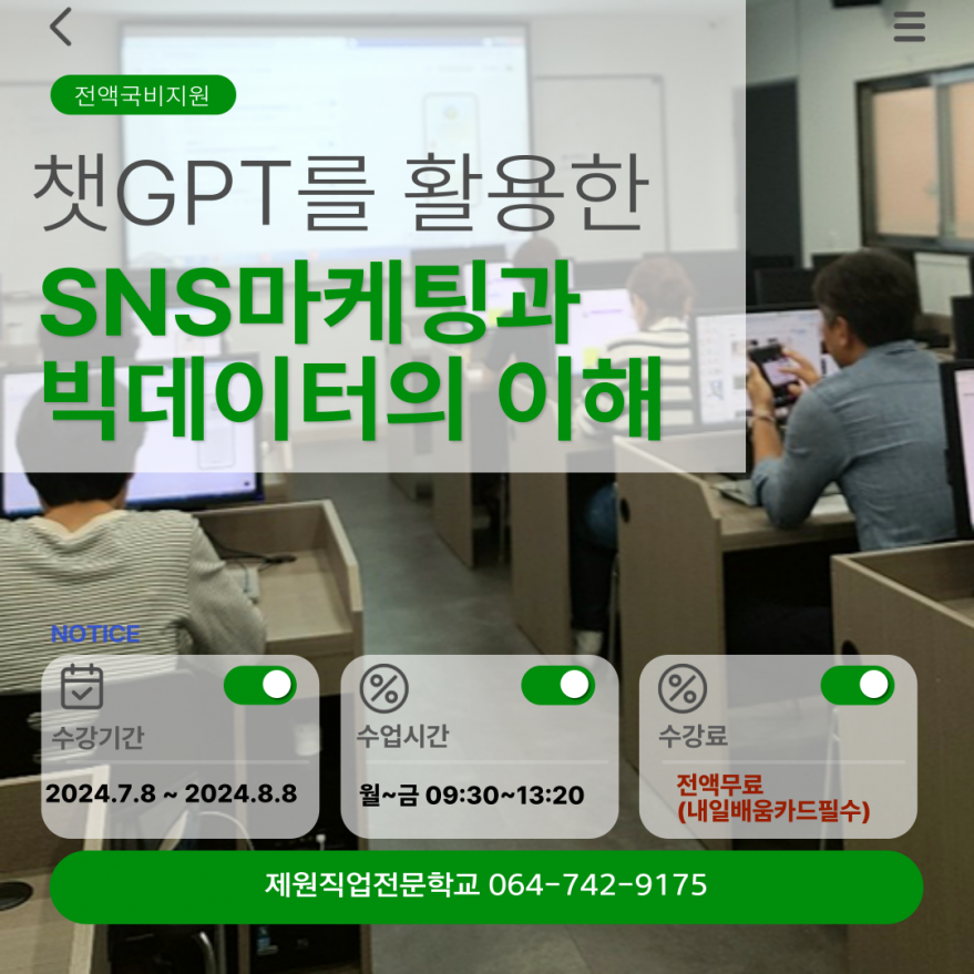[전액국비지원] SNS온라인 마케팅 과정 페이지 정보 작성자 제OOOOOO교 작성일24-06-19 11:01 조회4,498회 연락처 010-742-9175 급여 협의 : 협의 관련링크 본문 주소 : 제주특별자치도 제주시 노연로 119 3층 이전글 다음글 목록