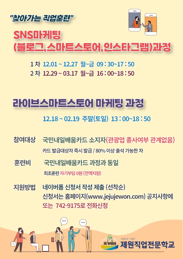 1. 올해 연말까지 시범사업으로 열리는 찾아가는 직업훈련과정은 최고수준의 SNS마케팅과정을 무료로 국비지원받으며 수강할 수 있는 다시 없는 기회